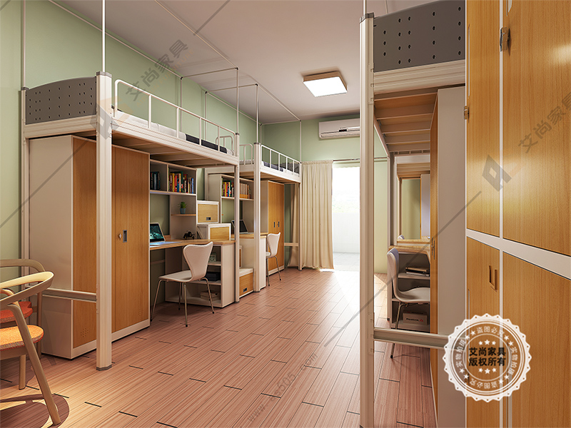 大學是宿舍生活是非常愜意,舒適的。躺在床上暢談理想和未來。和室友一起嬉鬧。這是一款比較常見的上面是床下面是桌子和衣柜,非常的人性化。這樣我們就能夠?qū)?、衣服、電腦一起放在這里,這個其實就是連體公寓床。